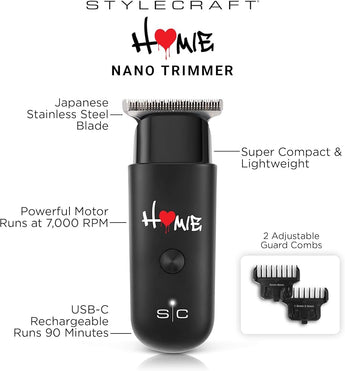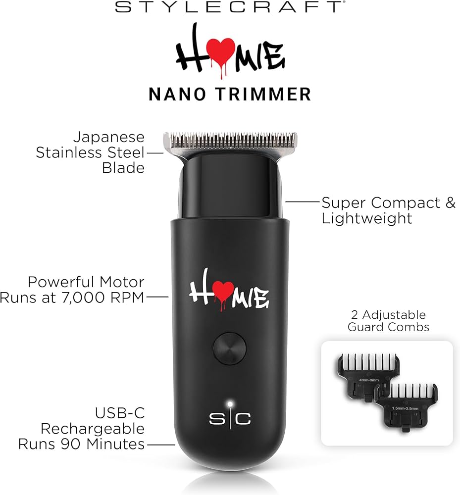 The StyleCraft Homie Trimmer is a compact, professional-grade trimmer designed for precision, power, and portability. It features a 7,000 RPM rotary motor and a Japanese stainless steel blade for sharp, consistent cutting with reduced noise.